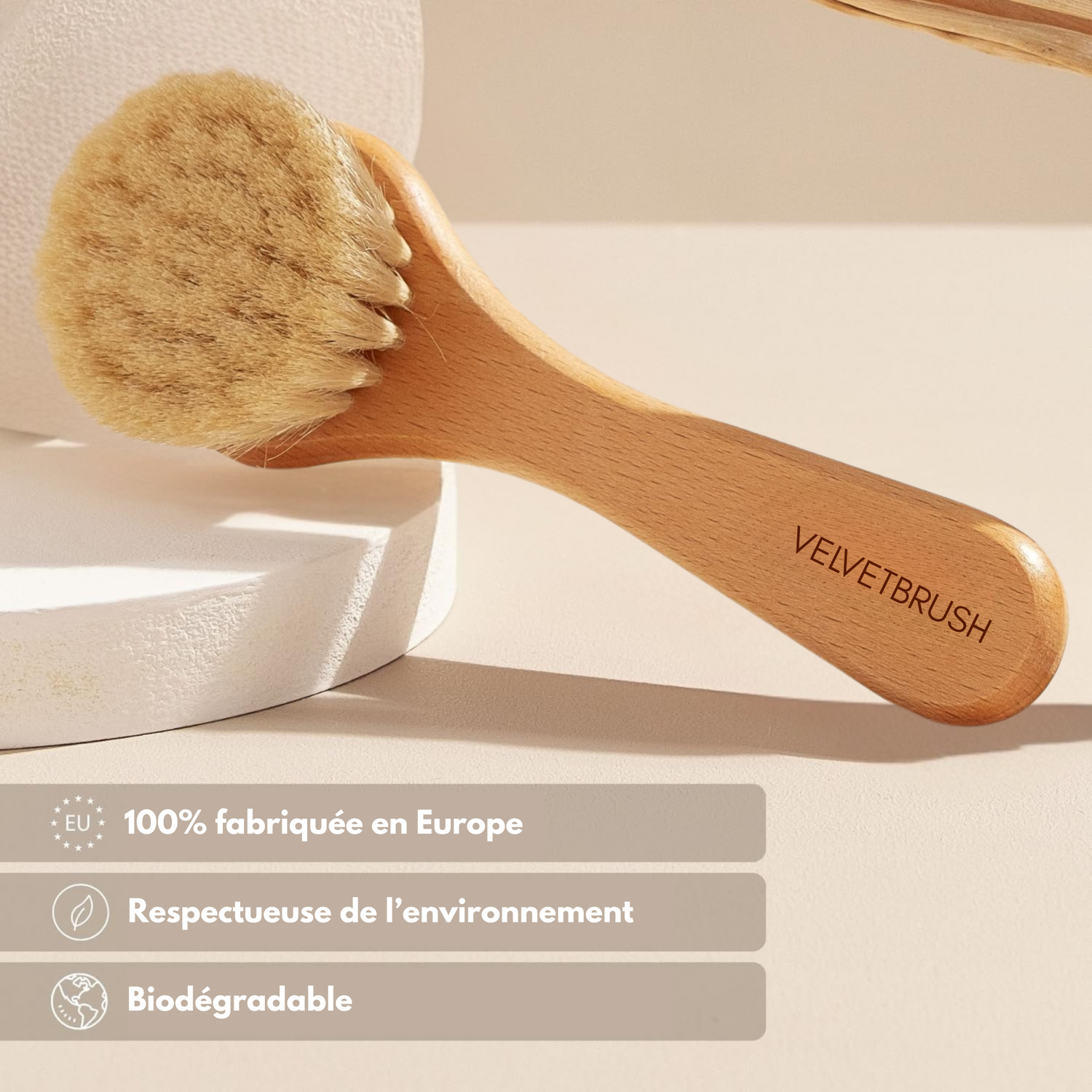 Ses poils naturels ultra-fins éliminent les cellules mortes sans agresser votre peau, même la plus sensible. Parfait pour les peaux réactives qui ne supportent pas les gommages classiques.